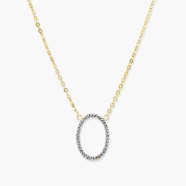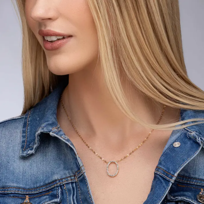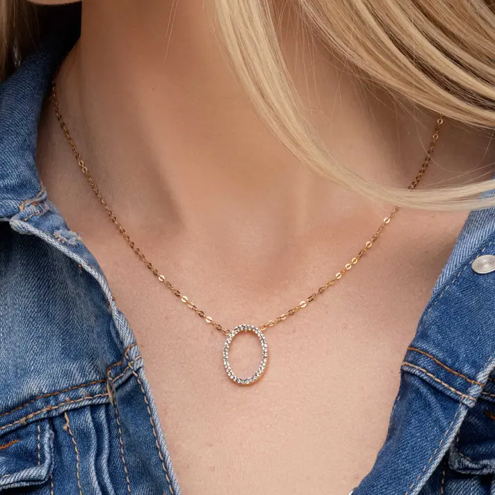 שרשרת זהב 14K וובמרכזה תליון אובאלי משובץ זירקונים . אורך השרשרת 41 ס"מ + 4 ס"מ הניתנים להארכה. המחיר כולל את התליון והשרשרת. מידות התליון 2.0 *1.4 ס"מ