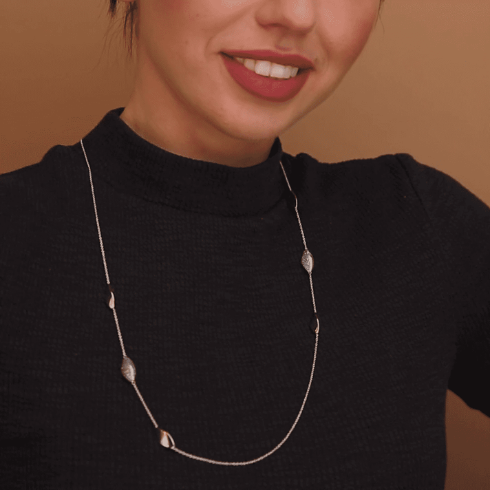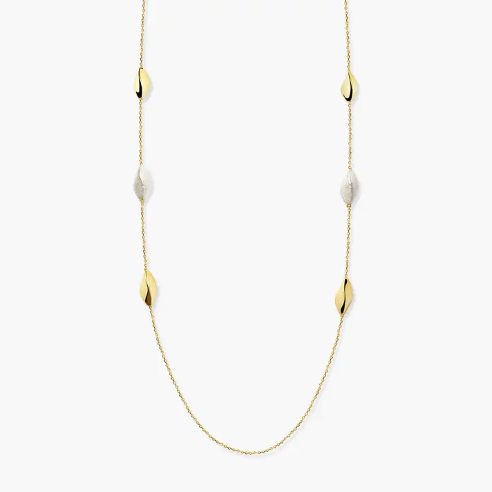 שרשרת זהב 14K ועליה אבני זהב בגימור מבריק כאשר 2 מהן מצופות בקריסטלים נוצצים. אורך השרשרת 70 ס"מ, גודל אבני הזהב 1.5*0.7 ס"מ.