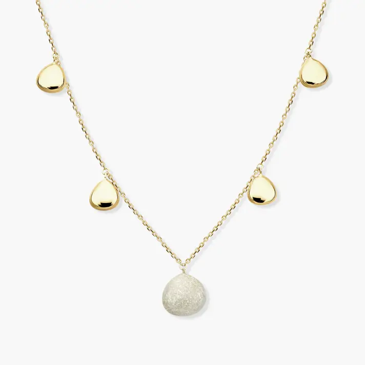 שרשרת זהב 14K עליה תליות טיפות זהב בגימור מבריק ובמרכזה טיפת זהב מצופה בקריסטלים נוצצים. אורך השרשרת 43 ס"מ