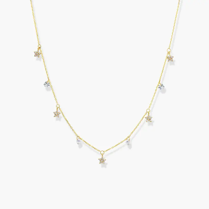 שרשרת זהב 14K עליה תלויים כוכבים משובצים בזירקונים נוצצים ולידים זירקונים עגולים נוצצים . אורך השרשרת 40 ס"מ + 3 ס"מ איתם ניתן להאריך את השרשרת.