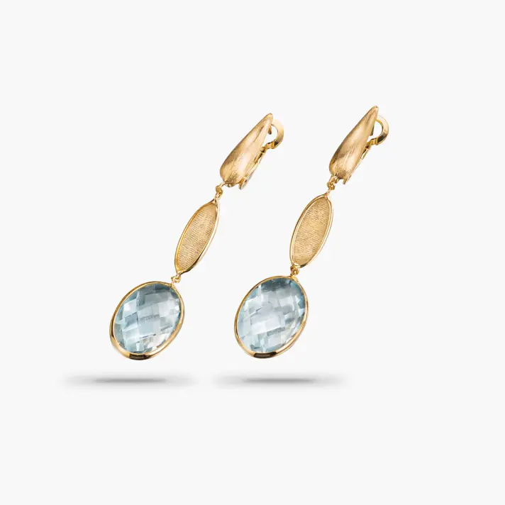 עגילי זהב 14K משובצים באבני בלו ספיר. אורך העגיל 4.65 ס"מ. מידות החוליה לא משובצת 1.3*0.5 ס"מ. מידות החוליה עם אבן חן 1.5*1.0 ס"מ