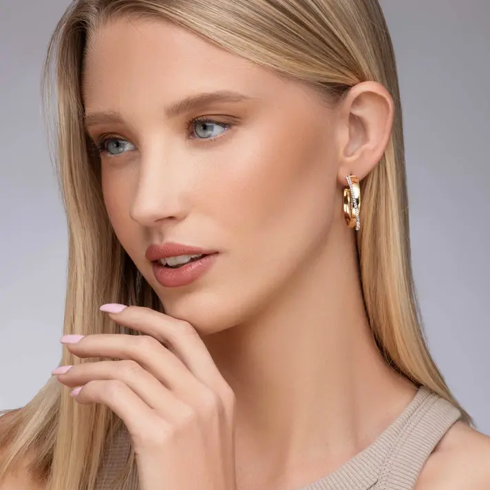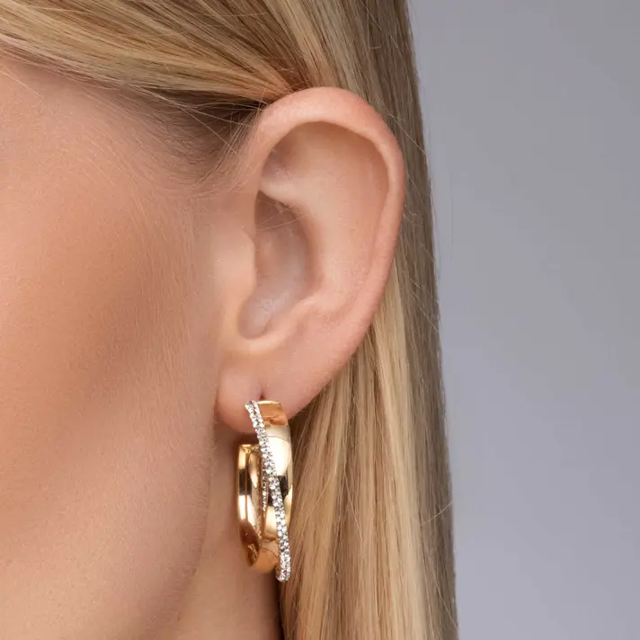 עגילי זהב 14K חישוקיים מעוטרים באבני זירקון. קוטר העגילים 2.5 ס"מ. רוחב העגיל 0.4 מ"מ