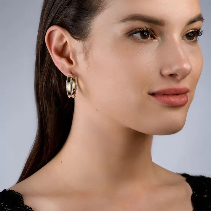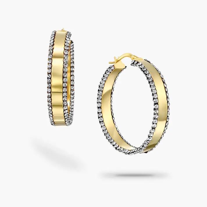 עיגולי זהב 14K בצורת חישוק משובצים שתי שורות זירקונים . קוטר העגילים 3.0 ס"מ. רוחב העגיל 5.5 מ"מ