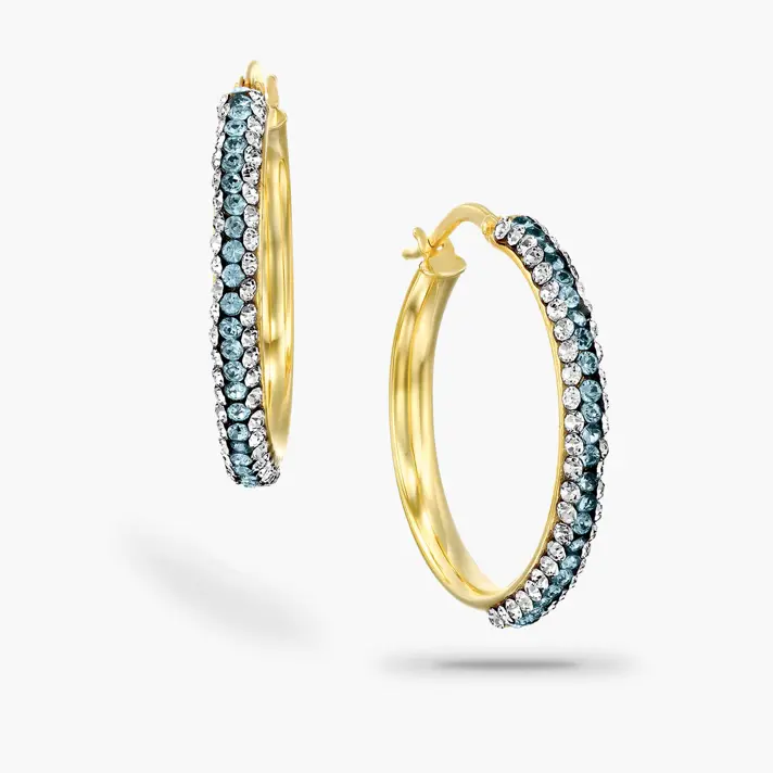 עגילי זהב 14K בצורת חישוק המשובצים בזירקונים נוצצים ושורה של אבני חן כחולות העוברת באמצע העגיל. קוטר העגילים 2 ס"מ.