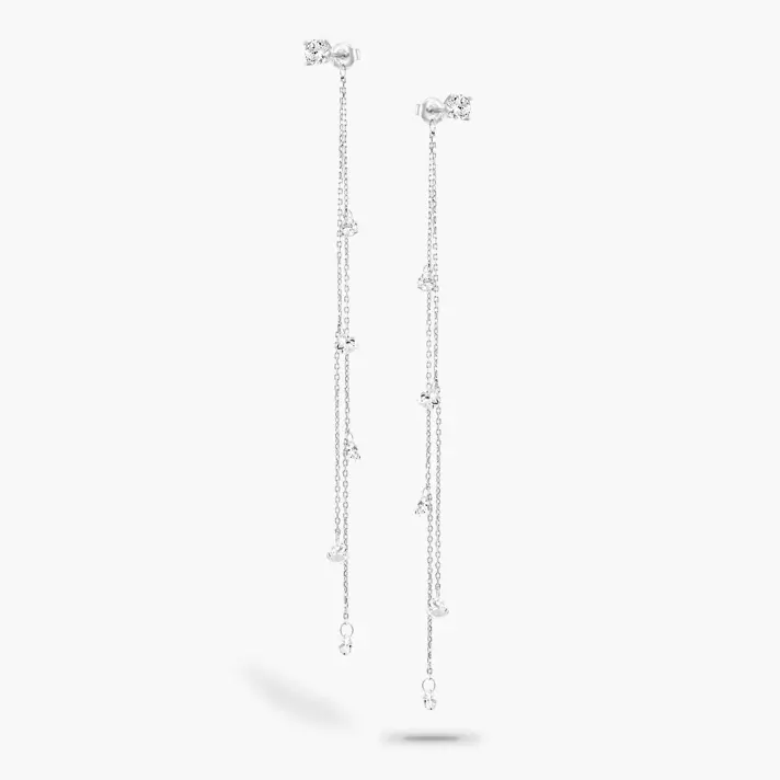 עגילי זהב 14K באורך 11 ס"מ ולאורכם תלויים זירקונים בחיתוך לב.