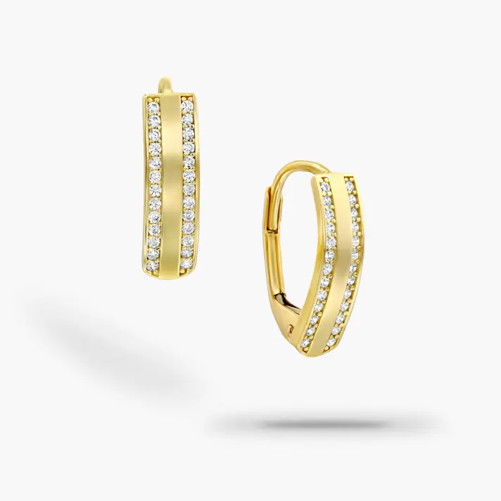 עגילי זהב 14K משובצים לאורכם בזירקונים נוצצים. אורך העגיל 1.5 ס"מ. רוחב העגיל 4 מ"מ
