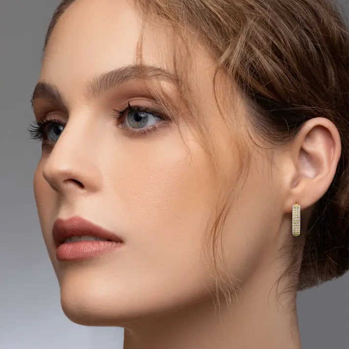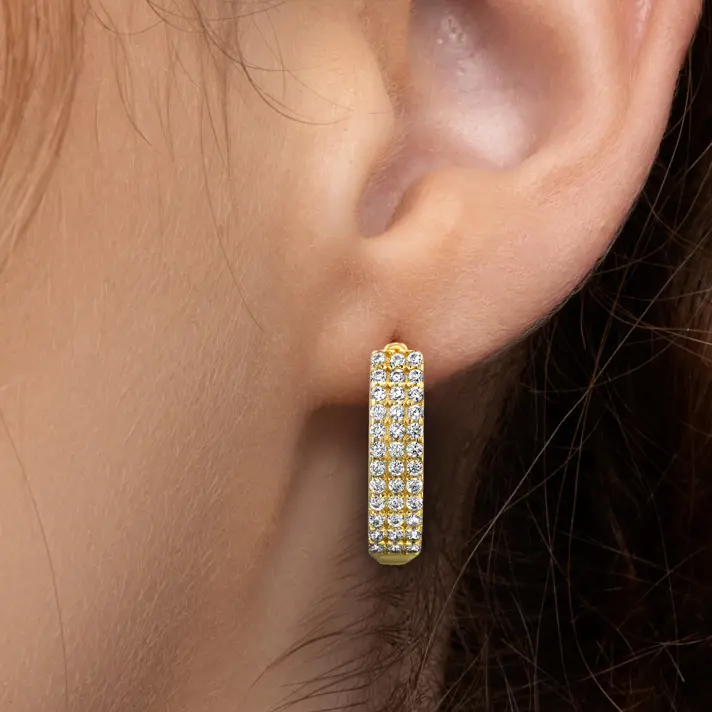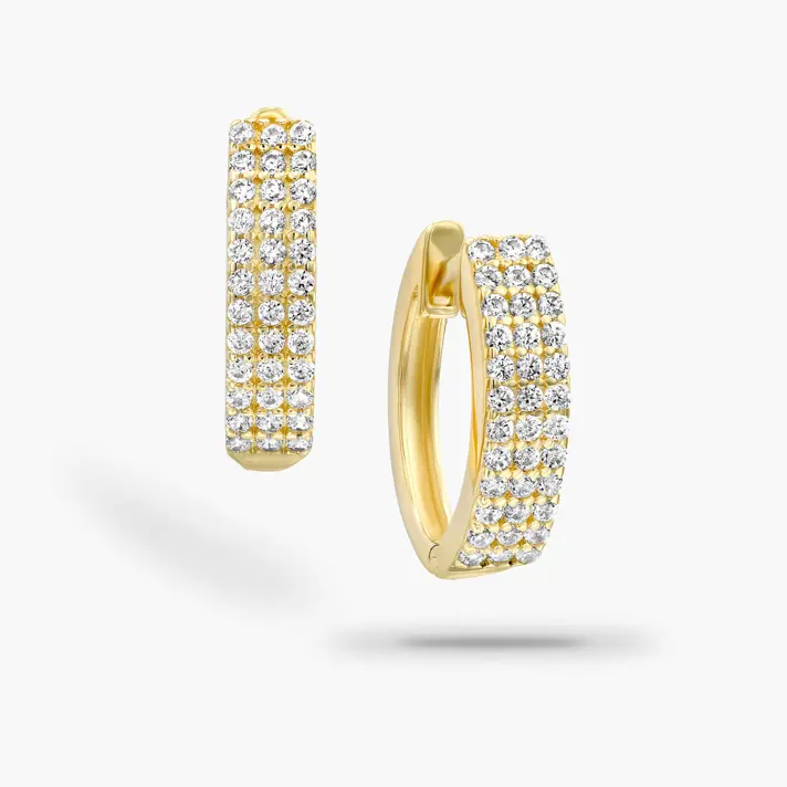 עגילי זהב 14K צהוב משובצים בזירקונים. אורך העגילים 1.3 ס"מ. רוחב העגיל 0.3 מ"מ
