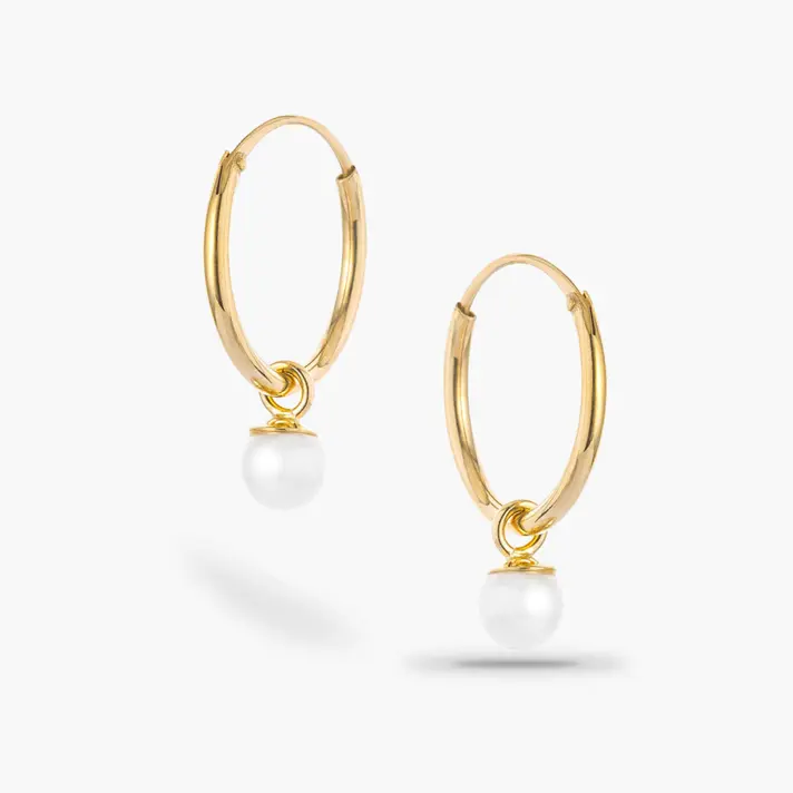 עגילי זהב 14K בצורת חישוק המשובצים באבן דמויית פנינה. קוטר החישוק 1.1 ס"מ. קוטר הפנינה 3.5 מ"מ
