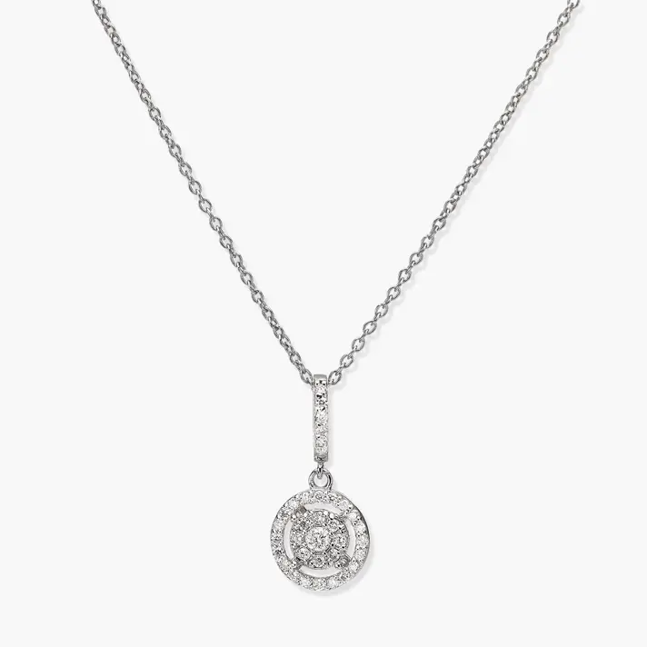 תליון זהב לבן ובמרכזו 3 מעגלי יהלומים . סה"כ משובצים בתליון 35 יהלומים טבעיים ונוצצים. קוטר התליון 7 מ"מ.