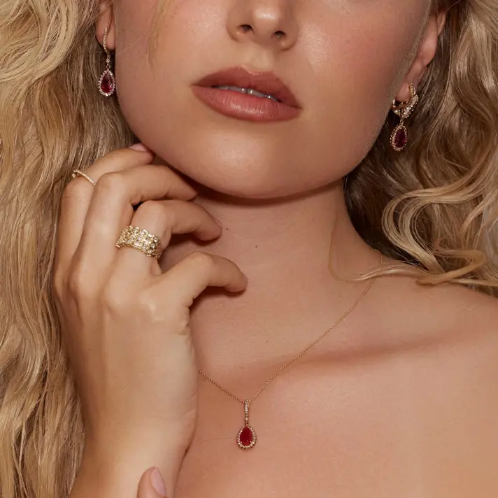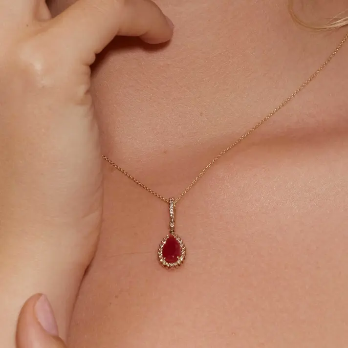 תליון זהב 14K המשובץ באבן Ruby-Glass אדומה מוקפת 31 יהלומים טבעיים ונוצצים. אורך התליון 2.7 ס"מ. אורך החלק המשובץ באבן הרובי 1.3 ס"מ ורוחבו 1 ס"מ.