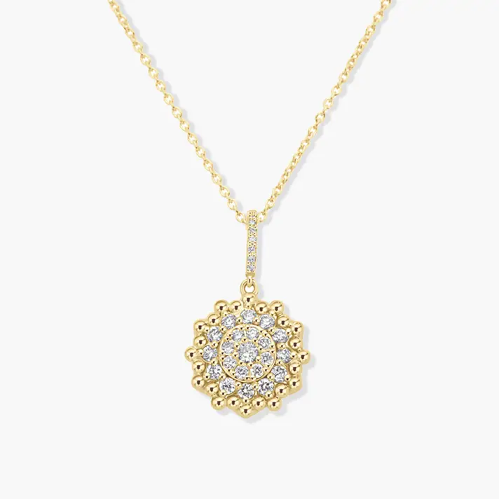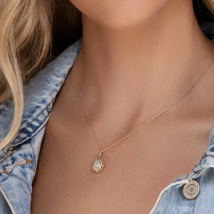 תליון זהב 14K המשובץ 28 יהלומים טבעיים ונוצצים מוקפים בנקודות זהב מבריקות. קוטר התליון 1.1 ס"מ.