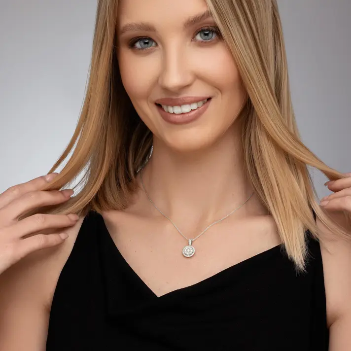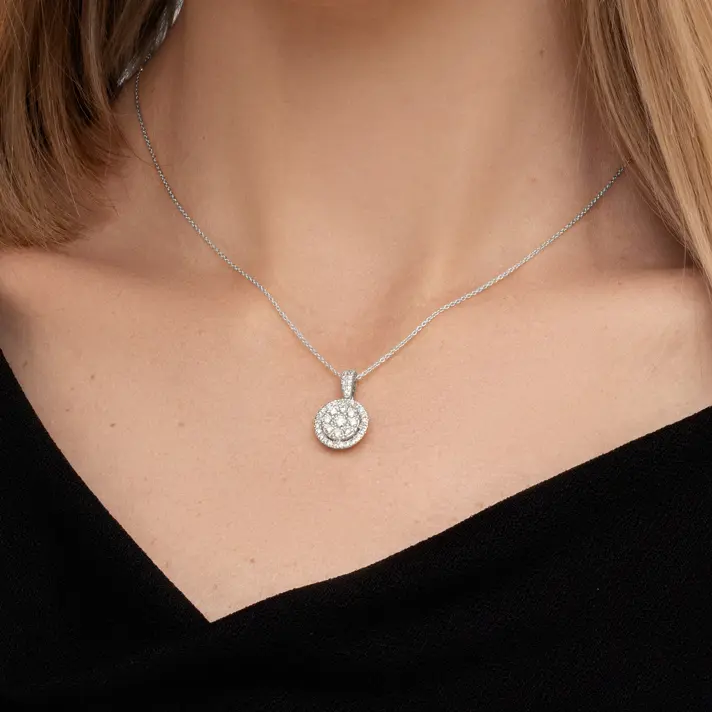 תליון זהב 14K לבן ובמרכזו פרח משובץ ומוקף ב 42 יהלומים טבעיים ונוצצים. קוטר התליון 1.2 ס"מ