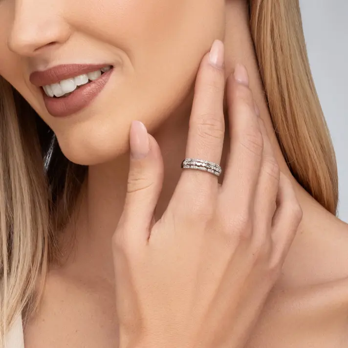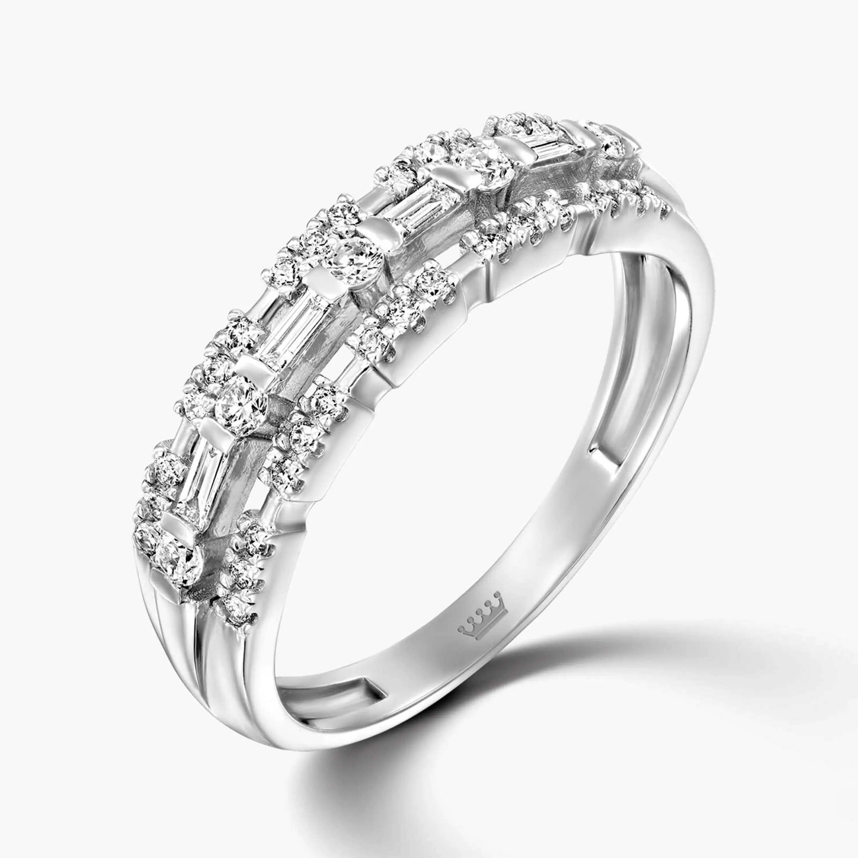 טבעת זהב 14K לבן משובצת יהלומים בחיתוך יוקרתי מסוג באגט ועגול. סה"כ משובצים בטבעות 39 יהלומים במשקל 0.37 קראט. נמצא עגיל תואם