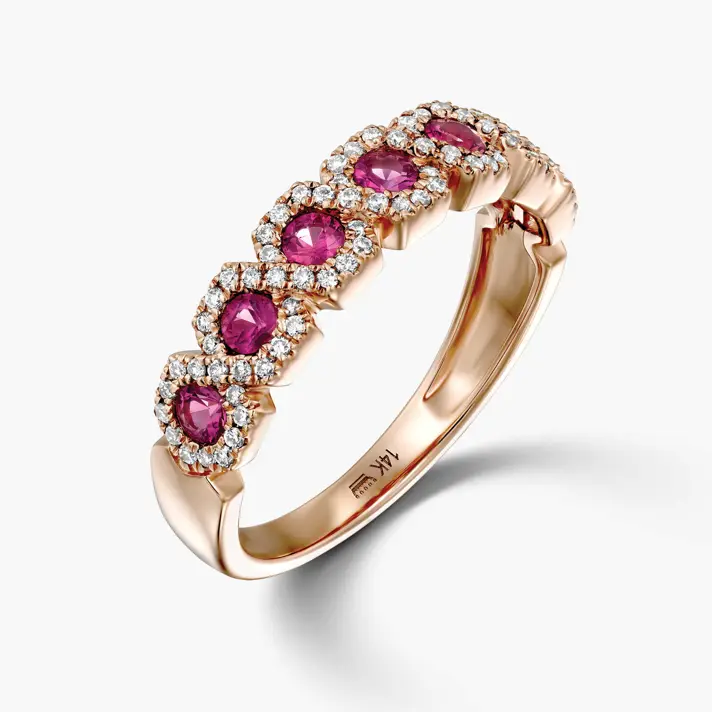 טבעת זהב 14K אדום המשובצת 7 אבני רובי וורודות מוקפות 64 יהלומים טבעיים ונוצצים !