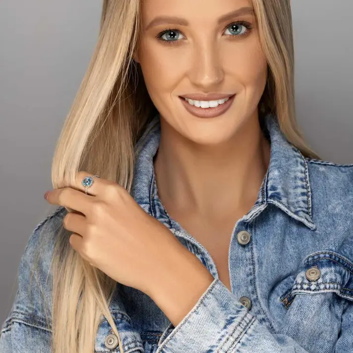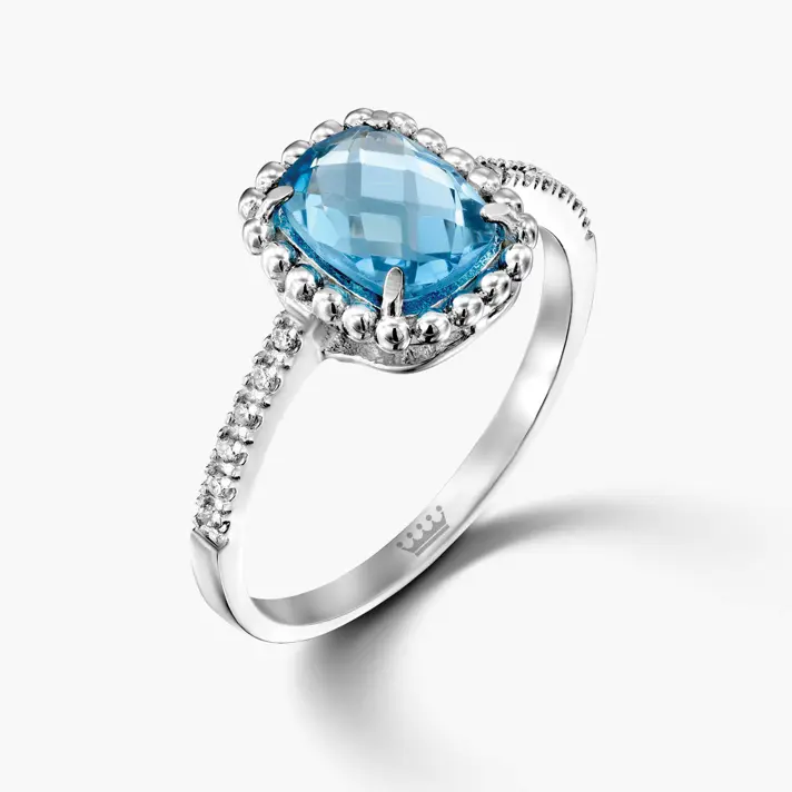 טבעת זהב 14K משובצת באבן בלו טופז יוקרתית וגדולה ( 1.7 קראט) ומוקפת ב 12 יהלומים טבעיים ונוצצים.