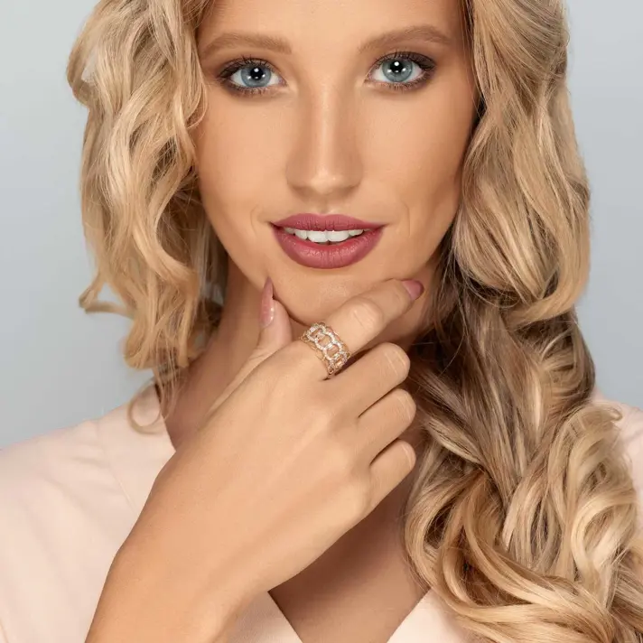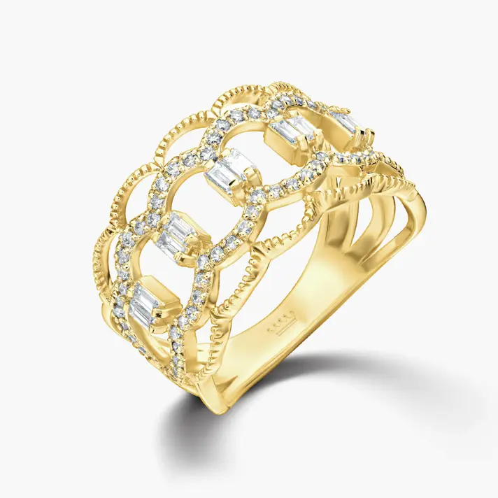 טבעת זהב 14K המעוצבת עם קשתות בזהב בעיבוד לייזר ובינהן עיגולים משובצים יהלומים טבעיים ונוצצים בחיתוך באגט ועגול. רוחב הטבעת 1.2 ס"מ.