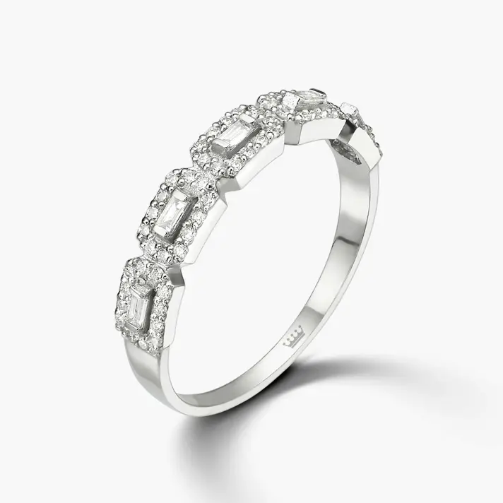 טבעת זהב 14K לבן המעוצבת כחוליות משובצות ב-5 אבני יהלום בחיתוך באגט יוקרתי מוקפות ב 60 אבני יהלום בחיתך עגול. כל היהלומים טבעיים ונוצצים. מידת כל חוליה בטבעת 6*3.6 מ"מ.