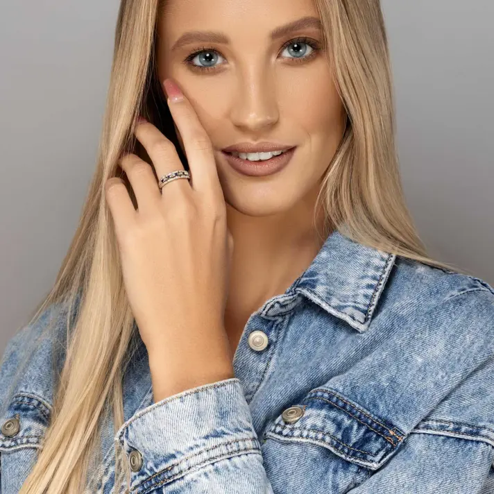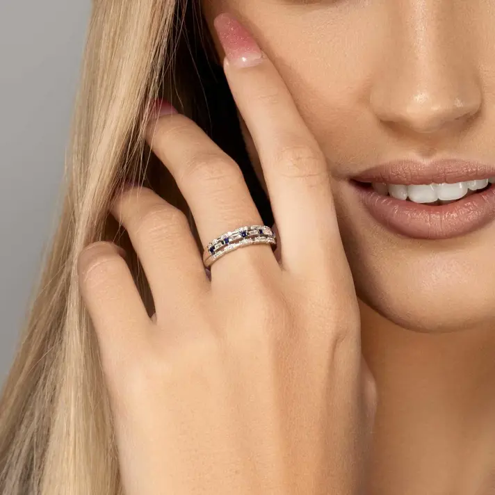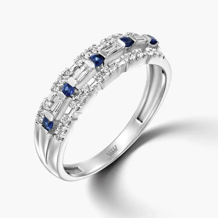 טבעת זהב 14K לבן, מעוצבת במרכזה עם יהלומים יוקרתיים בחיתוך באגט ועגול ובינהם אבני ספיר כחולות. סה"כ משובצים בטבעת 34 יהלומים טבעיים ונוצצים ו 5 אבני ספיר. רוחב הטבעת 5 מ"מ