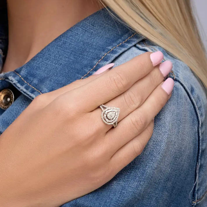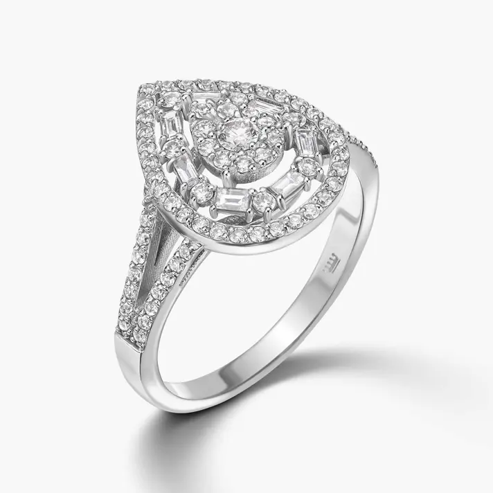 טבעת זהב 14K המעוצבת כטיפה המשובצת ב 7 יהלומים טבעיים ונוצצים בחיתוך באגט ובעוד 77 יהלומים טבעיים ונוצצים בחיתוך עגול. מידות הטבעת 1.3*1.5 ס"מ.