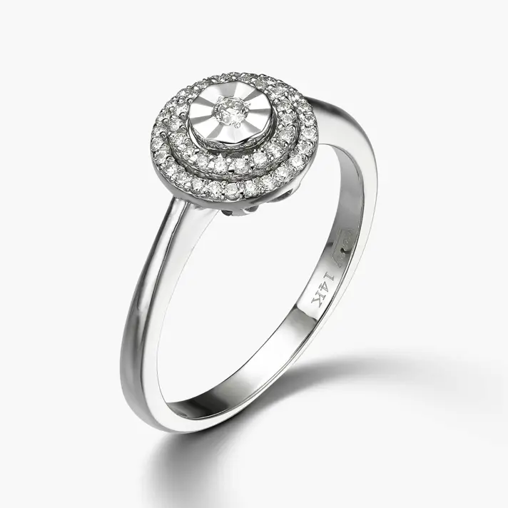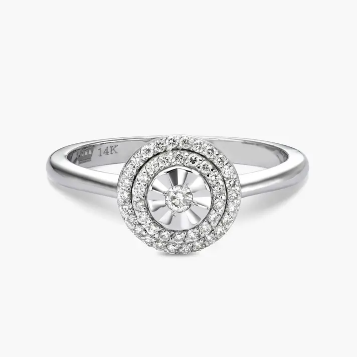 טבעת זהב 14K לבן ובמרכזה שני מעגלי יהלומים המקיפים משטח זהב בעיבוד לייזר ובמרכזו יהלום . סה"כ משובצים בטבעת 45 יהלומים טבעיים ונוצצים. קוטר ראש הטבעת 9.5 מ"מ כאשר קוטר משטח הזהב במרכז 4.8 מ"מ.