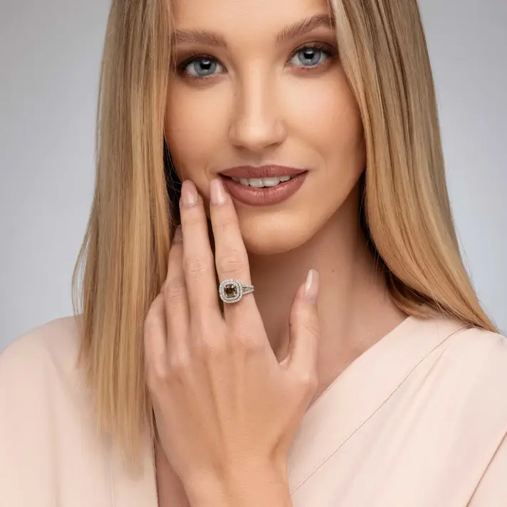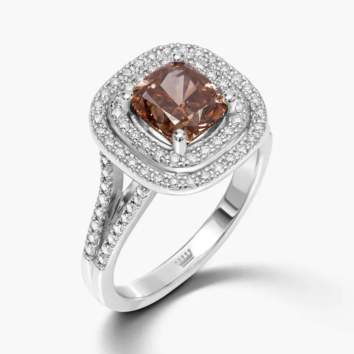טבעת זהב 14K משובצת ביהלום FANCY בצבע חום יוקרתי מוקף בשני מעגלים של 78 יהלומים לבנים . כל היהלומים טבעיים ונוצצים. מידות ראש הטבעת 1.1*1.1 ס"מ