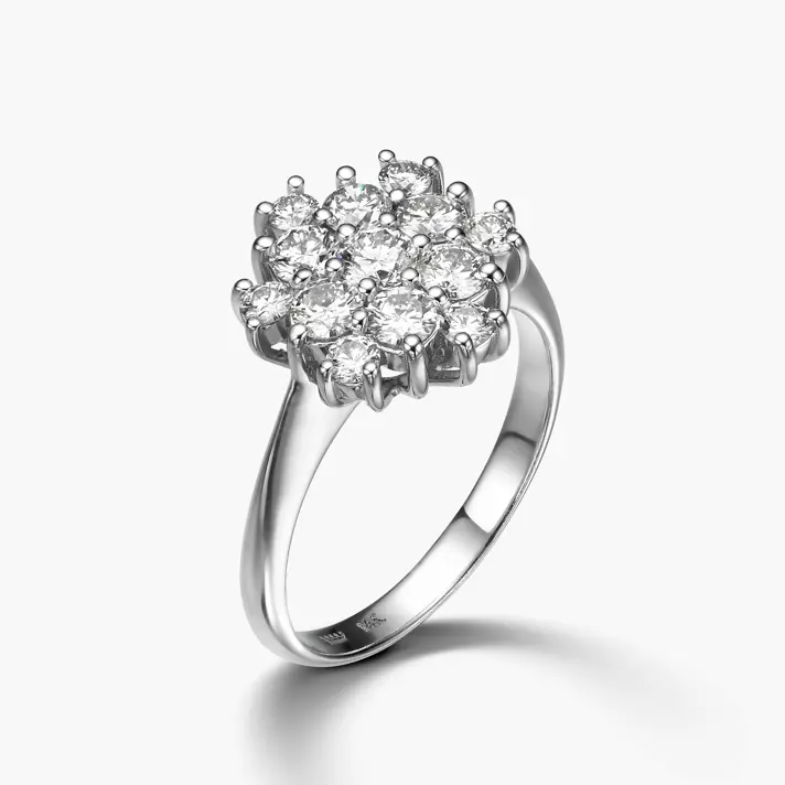 טבעת זהב 14K לבן משובצת פרח מרהיב משובץ 13 יהלומים טבעיים ונוצצים. קוטר ראש הטבעת 12.4 מ"מ.