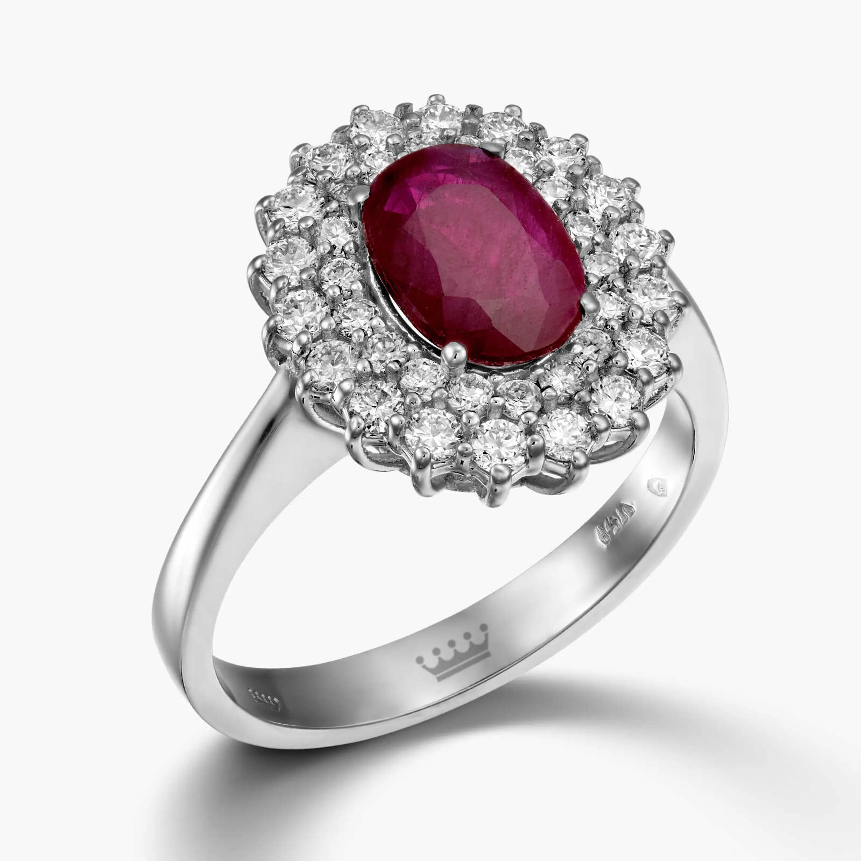 טבעת זהב 14K משובצת באבן RUBY אדומה וטבעית וסביבה 36 יהלומים נוצצים. אורך ראש הטבעת 1.4 ס"מ, רוחב - 1.2 ס"מ. אורך הרובי - 0.7 ס"מ, רוחב - 0.5 ס"מ