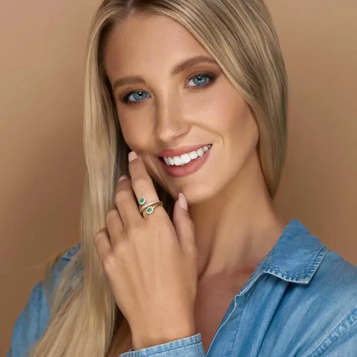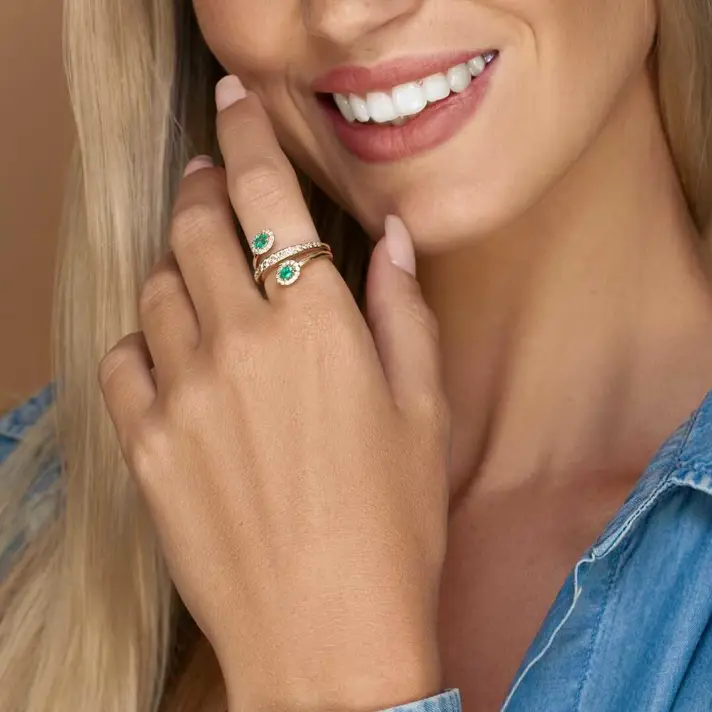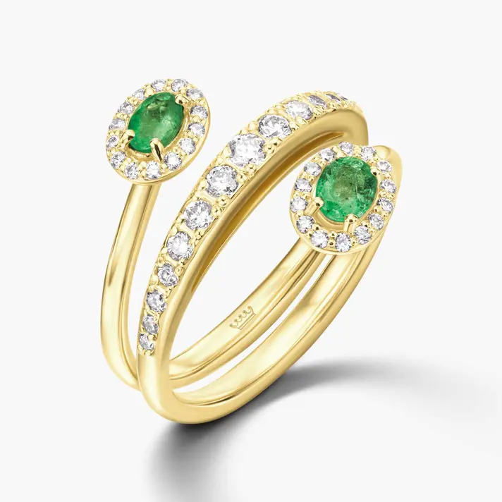 טבעת זהב 14K הנראית כמתלפפת על האצבע , משובצת בשתי אבני אמרלד ירוקות וב 43 יהלומים טבעיים ונוצצים. לפירוט נתוני האבנים יש ללחוץ על נתוני אבני החן.