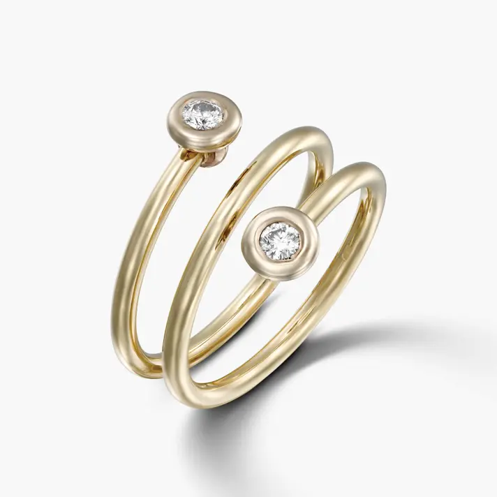 טבעת זהב 14K המעוצבת כסליל סביב האצבע ומשובצת ב-2 יהלומים טבעיים ( 0.14 קראט) בגימור של 57 משטחים המבטיח נצנוץ מושלם מכל יהלום. נקיון היהלומים SI והצבע H. רוחב הטבעת מ 1.25 ס"מ עד 0.6 ס"מ. קוטר האבן יהלום 0.4 ס"מ