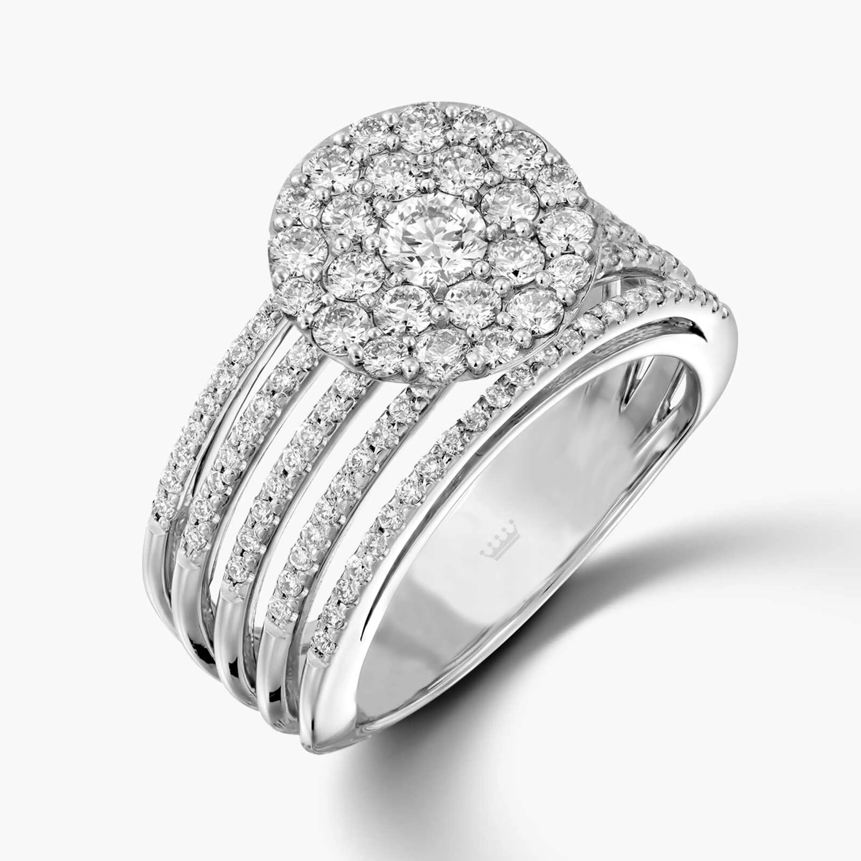 טבעת זהב 14K המעוצבת כ-5 טבעות המשובצות בחלקן העליון ביהלומים ומעליהן פרח יהלומים מרכזי שנוצץ למרחקים. בסה"כ משובצים בטבעת 141 יהלומים טבעיים במשקל של מעל לקראט!