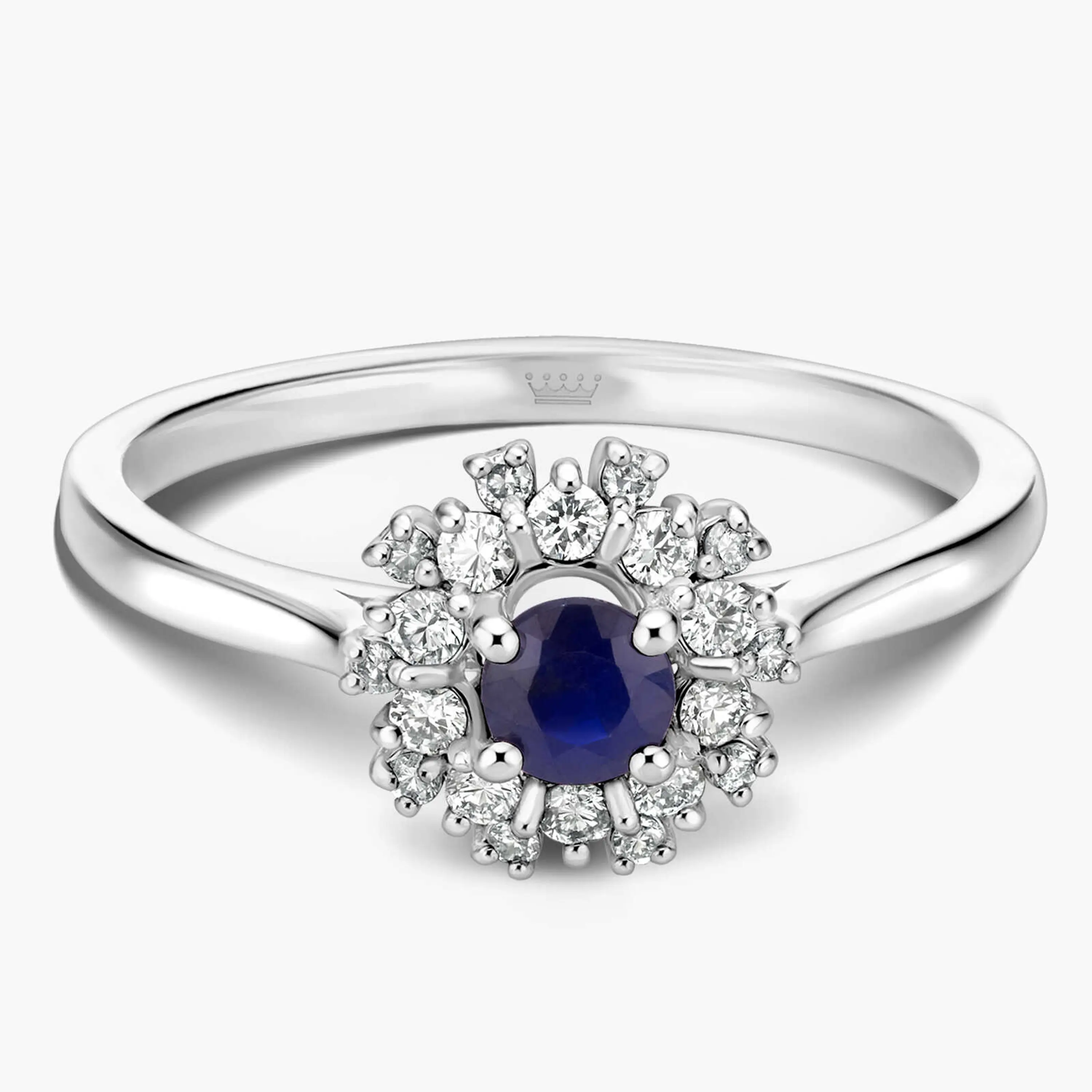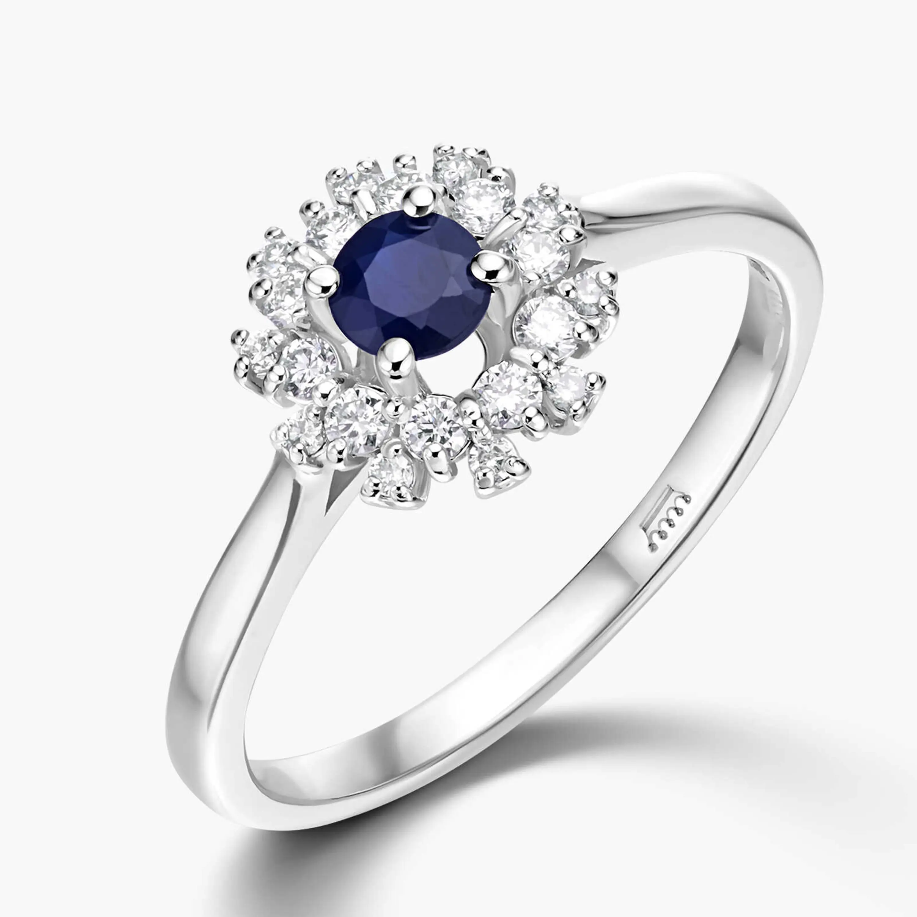 טבעת זהב משובצת פרח יהלומים ובמרכזו אבן ספיר כחולה ומלכותית. סה"כ משובצים בטבעת 20 יהלומים טבעיים ונוצצים. קוטר ראש הטבעת 9 מ"מ.