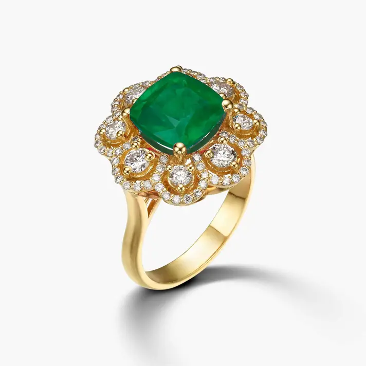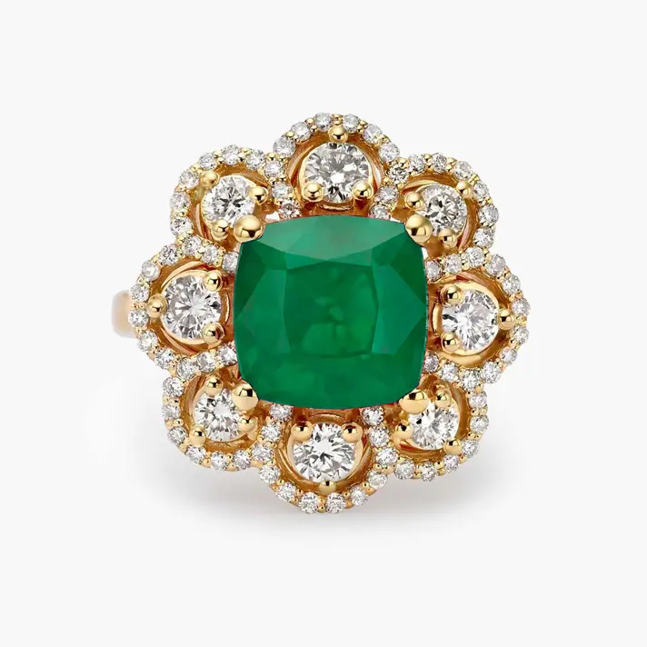 טבעת זהב 14K המשובצת במרכזה באבן רובי גלס אדומה ומרובעת המוקפת בפרח של 80 יהלומים טבעיים ונוצצים. קוטר ראש הטבעת 18.2 מ"מ ועובי הטבעת עצמה 3 מ"מ.