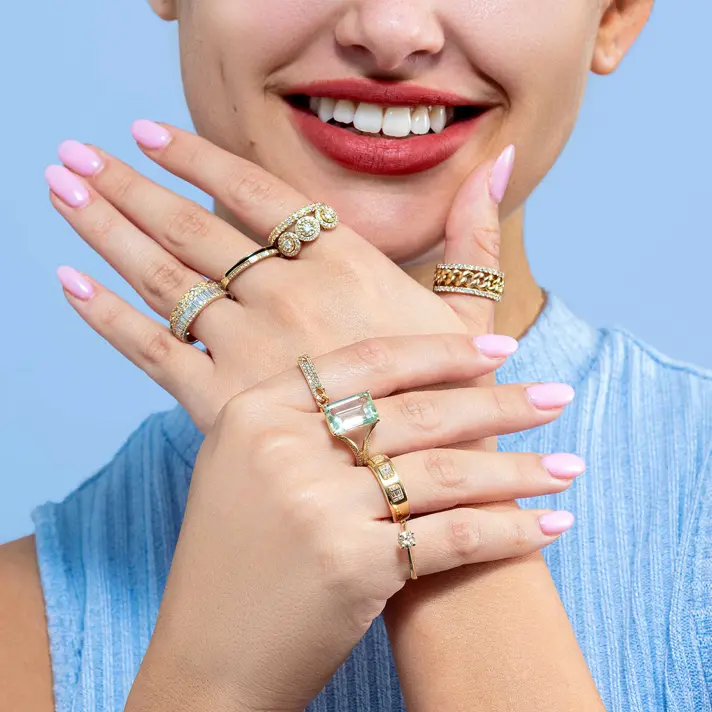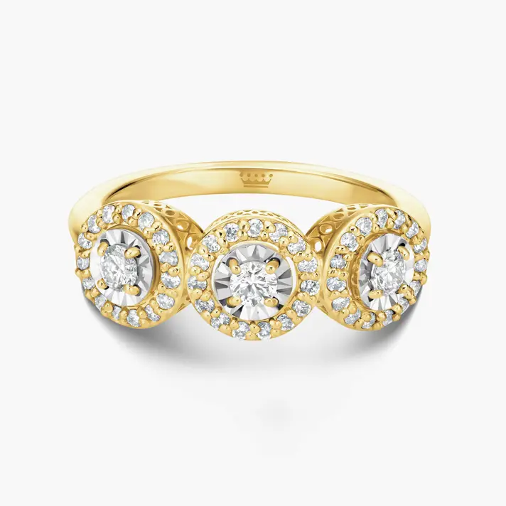 טבעת זהב 14K בעלת ראש המחולק לשלוש מעגלי יהלומים מקיפים עיגולי זהב בעיבוד לייזר מנצנץ ובאמצע העיגולים משובץ יהלום. סה"כ משובצים בטבעת 48 יהלומים טבעיים ונוצצים. קוטר כל עיגול בראש הטבעת 7 מ"מ, עוביו - 1.5 מ"מ