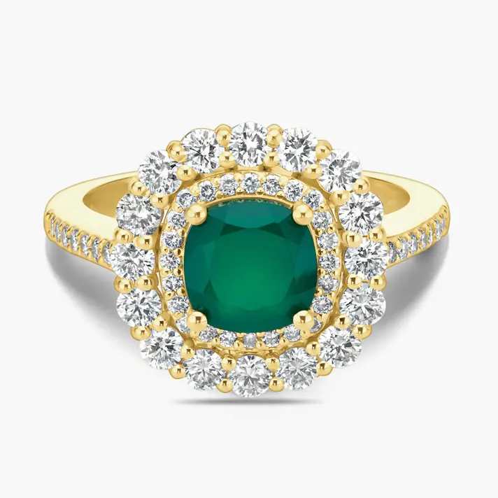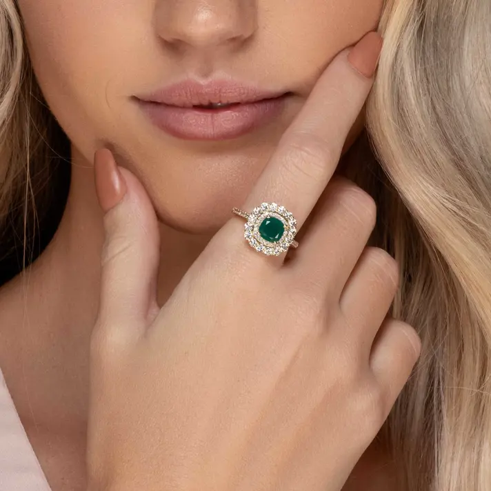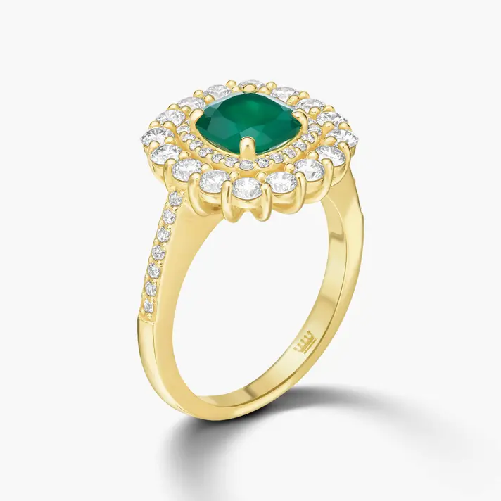 טבעת זהב 14K לבן משובצת באבן אגת ירוקה וסביבה 54 יהלומים נוצצצים.קוטר ראש הטבעת 1.5 ס"מ.עובי 2 מ"מ.קוטר אבן האגת 0.7 ס"מ