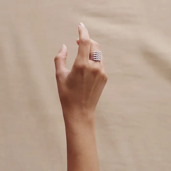 טבעת זהב 14K המעוצבת עם 5 טבעות שבסוף כל אחת מהן צורת חץ הפונה אל החץ שמולה ובין שני החצים שורה של יהלומים. סה"כ משובצים בטבעת 60 יהלומים טבעיים ונוצצים. רוחב הטבעת 1.7 ס"מ