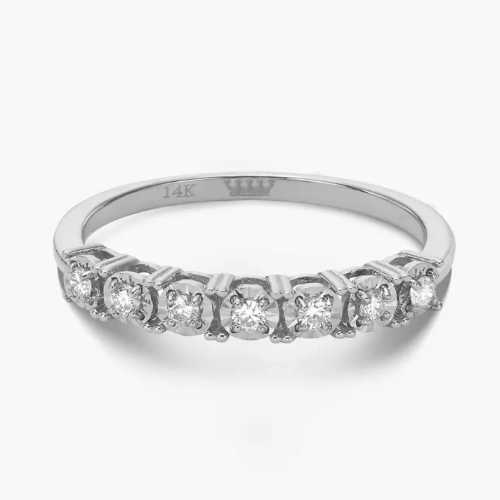 טבעת זהב לבן 14K המשובצת ב 7 יהלומים טבעיים ונוצצים בחלקה העליון. עובי הטבעת 2 מ"מ