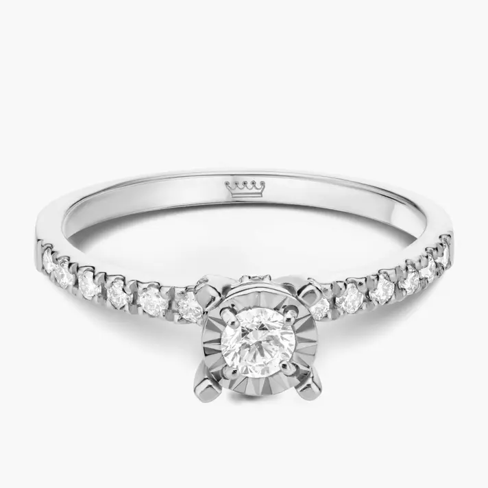 טבעת זהב 14K המשובצת 32 יהלומים טבעיים ונוצצים לאורך הטבעת ובמרכזה יהלום גדול טבעי ונוצץ. רוחב הטבעת 1.5 מ"מ. קוטר ראש הטבעת 6 מ"מ. גובה האבן המרכזית 7 מ"מ