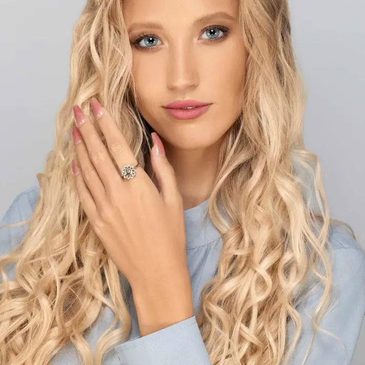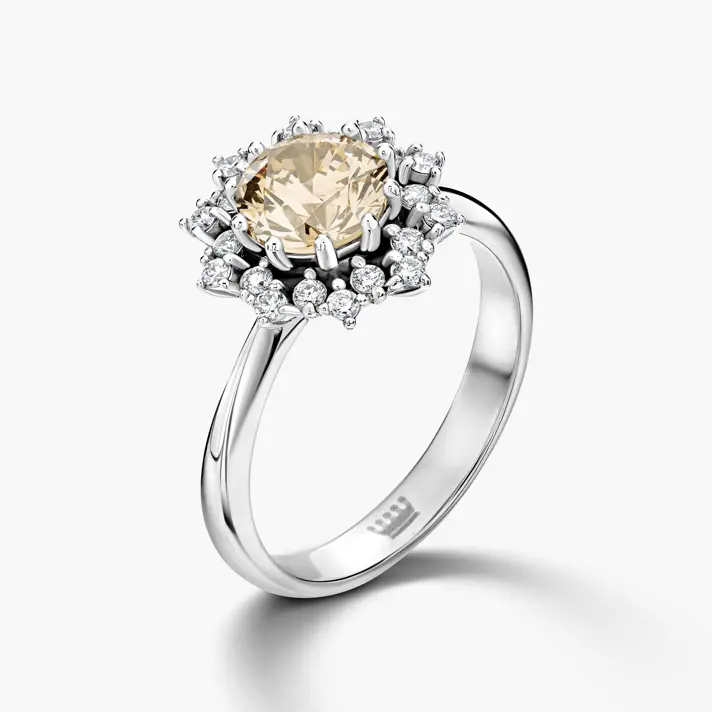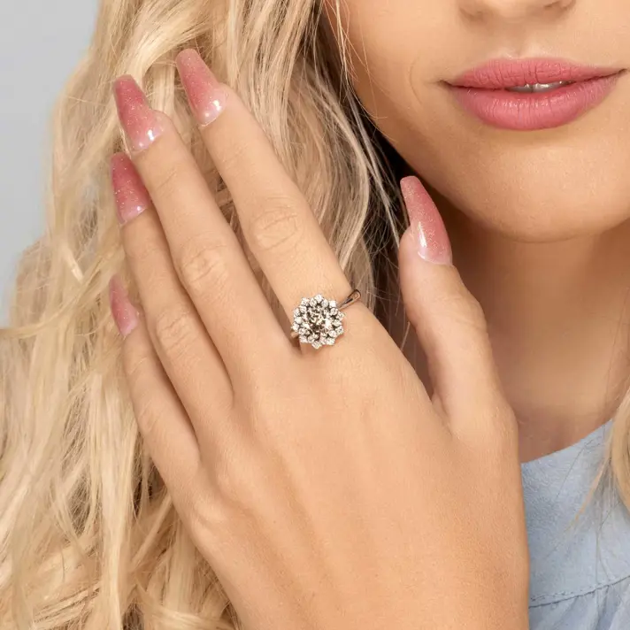 טבעת זהב 14K המשובצת במרכזה בפרח של 20 יהלומים לבנים ובמרכזו יהלום FANCY ( יהלום טבעי צבעוני) בצבע ירוק / חום / צהוב. כל היהלומים בטבעת טבעיים ונוצצים. לפרוט אודות נתוני היהלומים יש ללחוץ על נתוני אבני החן.