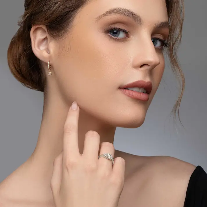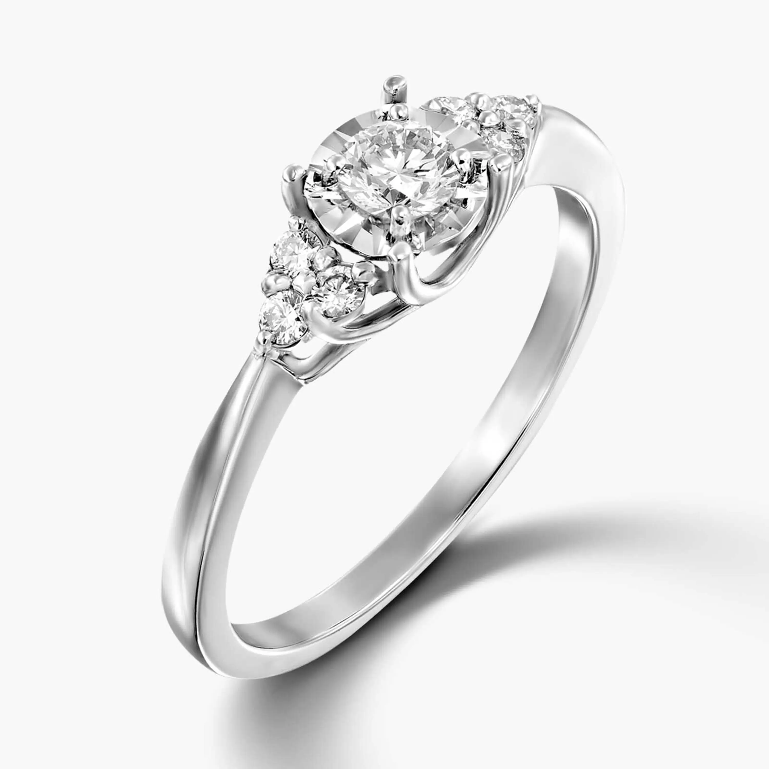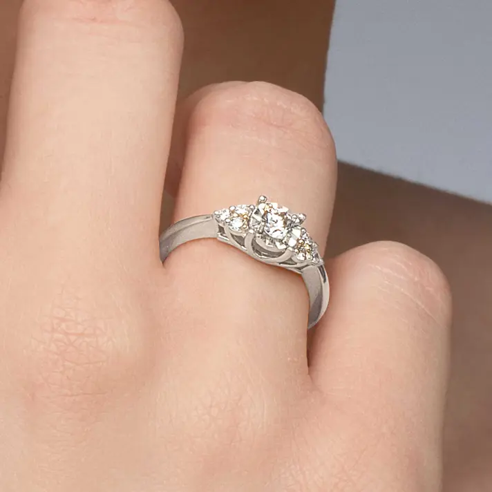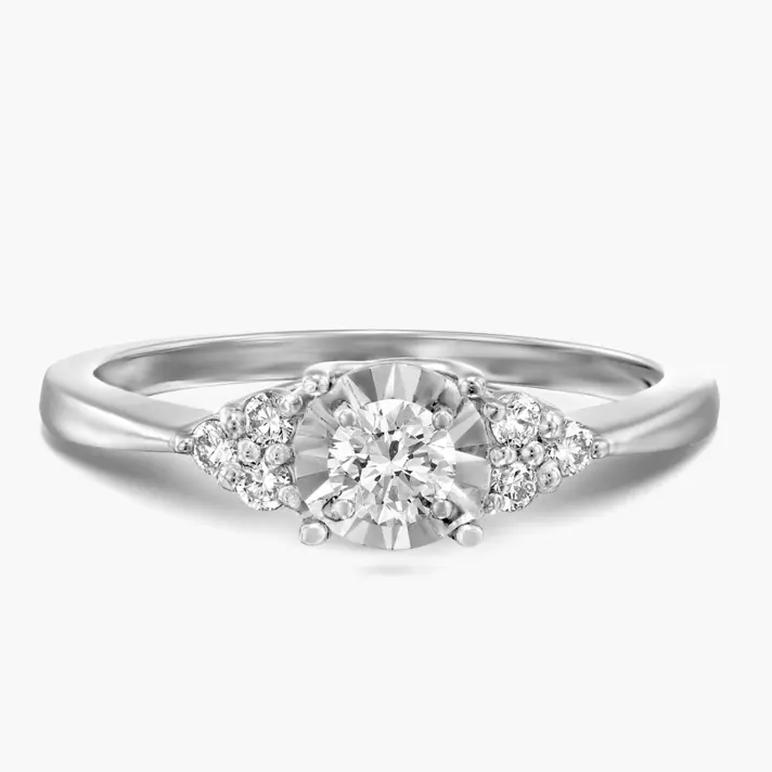 טבעת זהב 14K משובצת יהלום מרכזי נוצץ מוקף זהב בגימור לייזר היוצר נצנוץ סביב היהלום. משני צדידיו משובצים עוד 6 יהלומים. כל היהלומים טבעיים . לנתוני היהלומים יש ללחוץ על נתוני אבני החן. קוטר ראש הטבעת 0.6 ס"מ. רוחב הטבעת 1.5 מ"מ