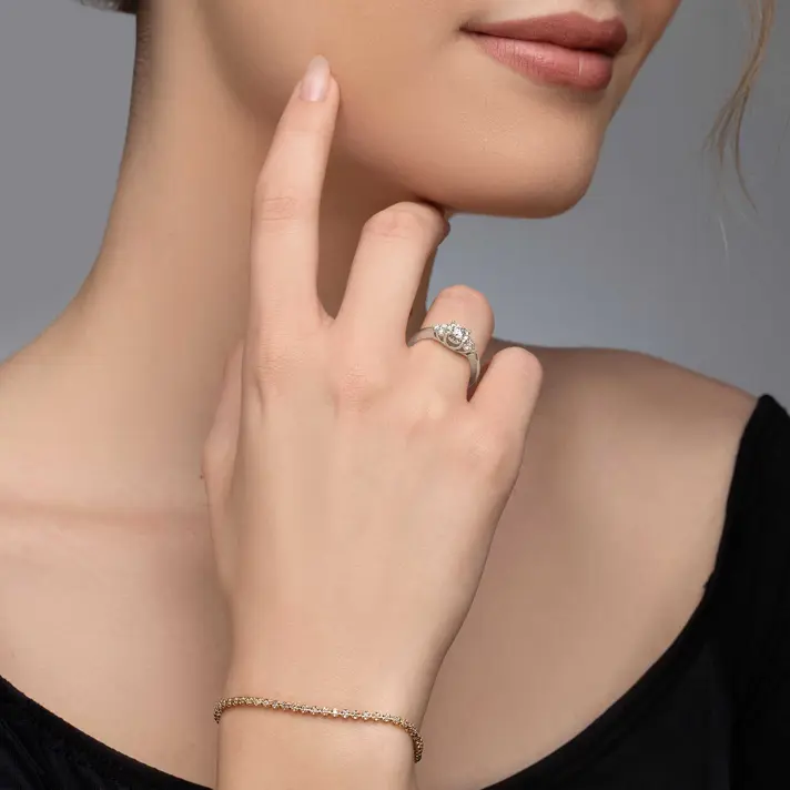 טבעת זהב משובצת יהלום מרכזי מוקף זהב בעיבוד לייזר