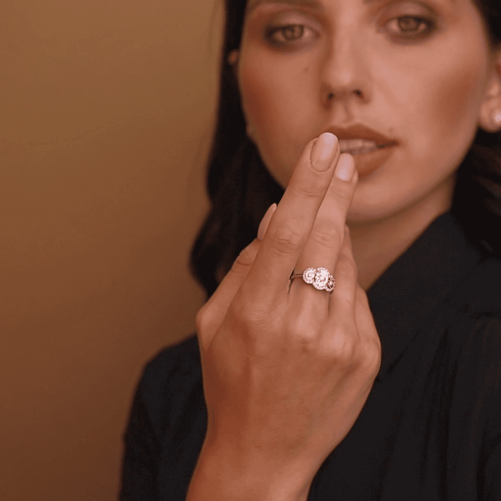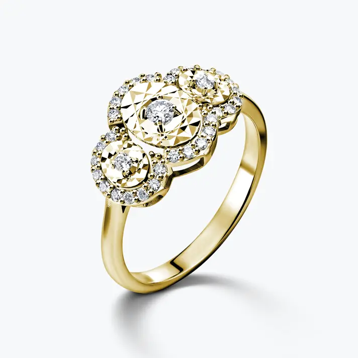 טבעת זהב 14K בעלת ראש משולש המשובץ 3 יהלומים מוקפים בזהב בעיבוד לייזר ייחודי ובהקפו יהלומים נוספים. סה"כ משובצים בטבעת 34 יהלומים טבעיים ונוצצים. לפירוט אודות היהלומים יש ללחוץ על נתוני אבני החן.