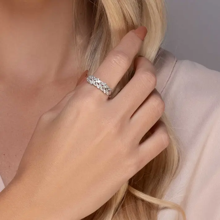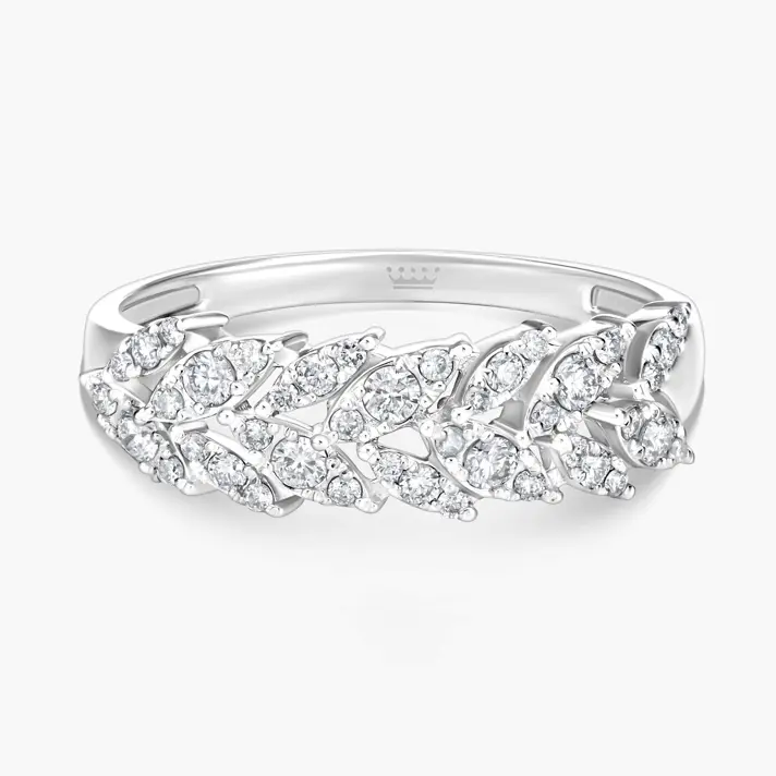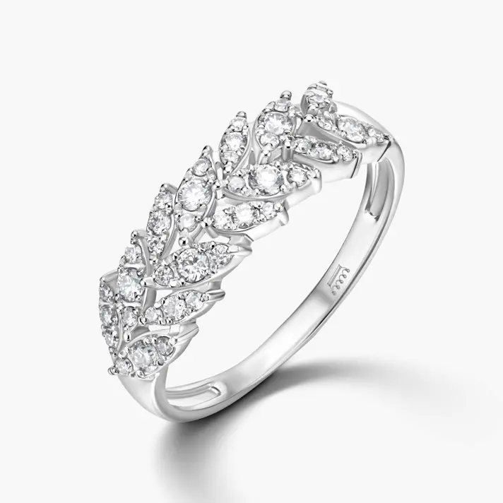 טבעת זהב לבן 14K המעוצבת בצורת עלים השזורים על האצבע ומשובצים ב 42 יהלומים טבעיים ונוצצים. לפירוט נתוני היהלומים ניתן ללחוץ על נתוני אבני החן. רוחב הטבעת 6 מ"מ בחלקה המשובץ.