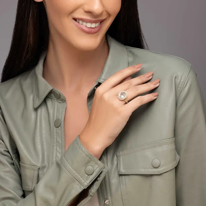 טבעת זהב 14K ובמרכזה אבן גרין אמטיסט מוקפת ביהלומים טבעיים ונוצצים.