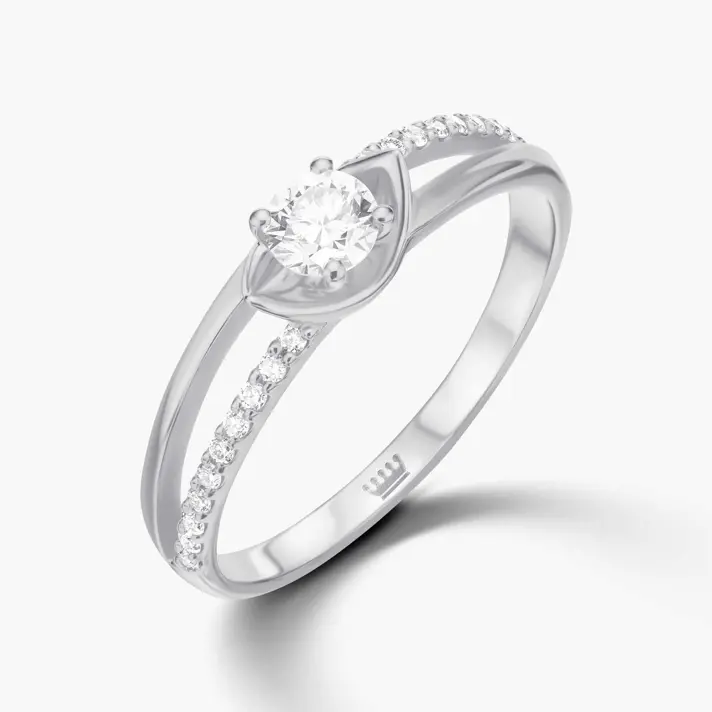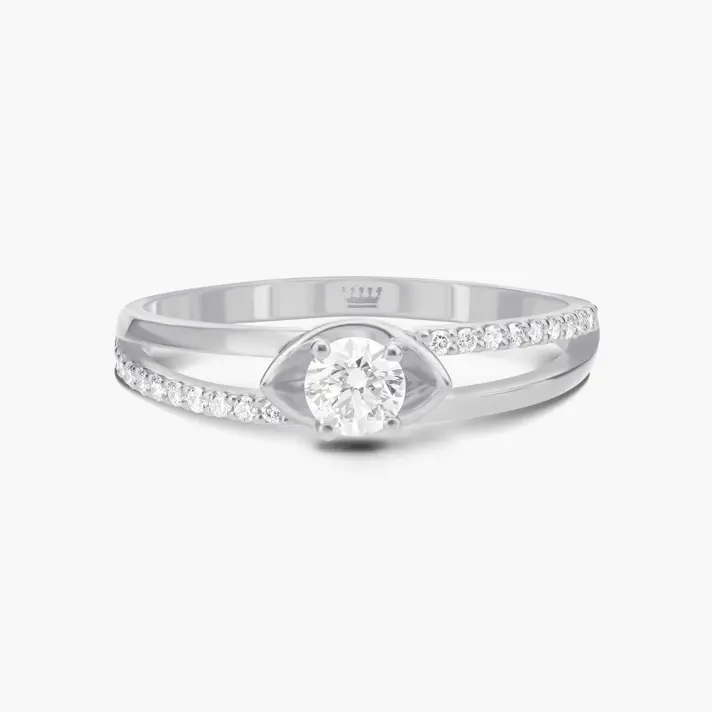 טבעת זהב 14K הנפתחת בחלקה העליון לשתי קשתות משובצות יהלומים ובראשן יהלום מרכזי גדול ומרשים. כל היהלומים טבעיים ונוצצים.