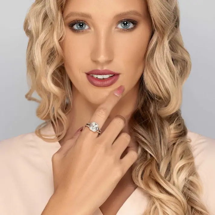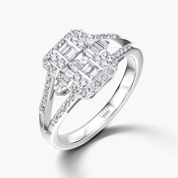 טבעת זהב 14K בעלת ראש המתפצל ל 2 קשתות ובראשן מלבן משובץ ביהלומים טבעיים בחיתוך באגט יוקרתי ובחיתוך עגול . סה"כ משובצים בטבעת 58 יהלומים במשקל 0.70 קראט , ברמת נקיון VS ובצבע G/H. מידות המלבן בראש הטבעת 1.1*1 ס"מ.