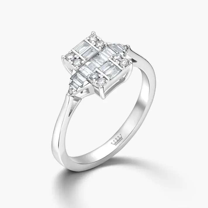 טבעת זהב 14K בעלת ראש מלבני משובץ 22 יהלומים טבעיים ונוצצים. קוטר ראש הטבעת 6X8 מ"מ. לפירוט נתוני היהלומים ניתן ללחוץ על נתוני אבני החן.