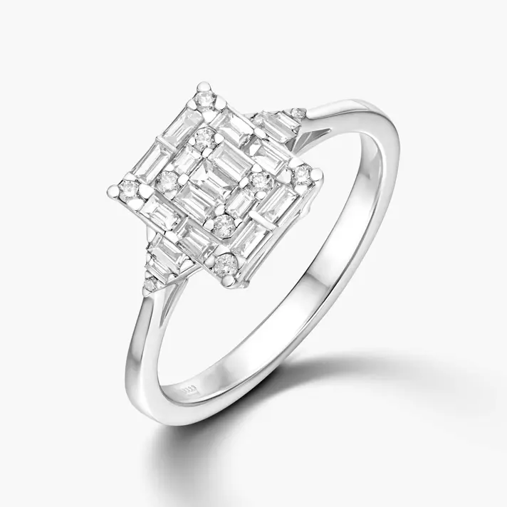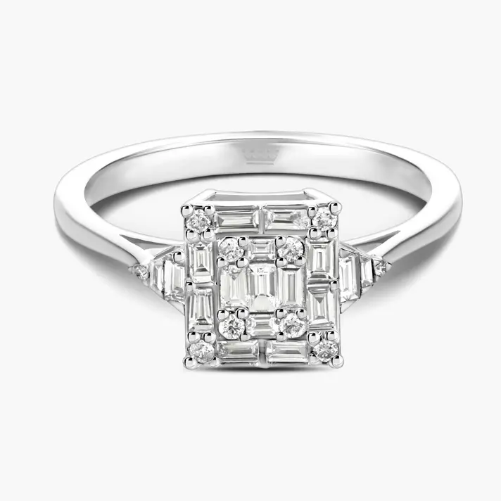 טבעת זהב 14K לבן בעלת ראש מלבני משובצת ב 27 יהלומים יוקרתיים בחיתוך באגט ועגול. מידת ראש הטבעת 8*9.5 מ"מ.