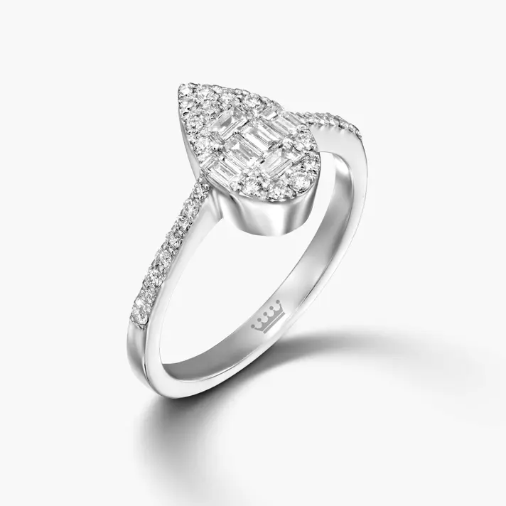 טבעת זהב 14K ובמרכזה מבנה טיפה המשובץ ביהלומי באגט יוקרתיים ויהלומים עגולים. סה"כ משובצים בטבעת 35 יהלומים טבעיים ונוצצים במשקל 0.41 קראט. אורך ראש הטבעת 1.0 ס"מ, רוחב- 0.6 ס"מ