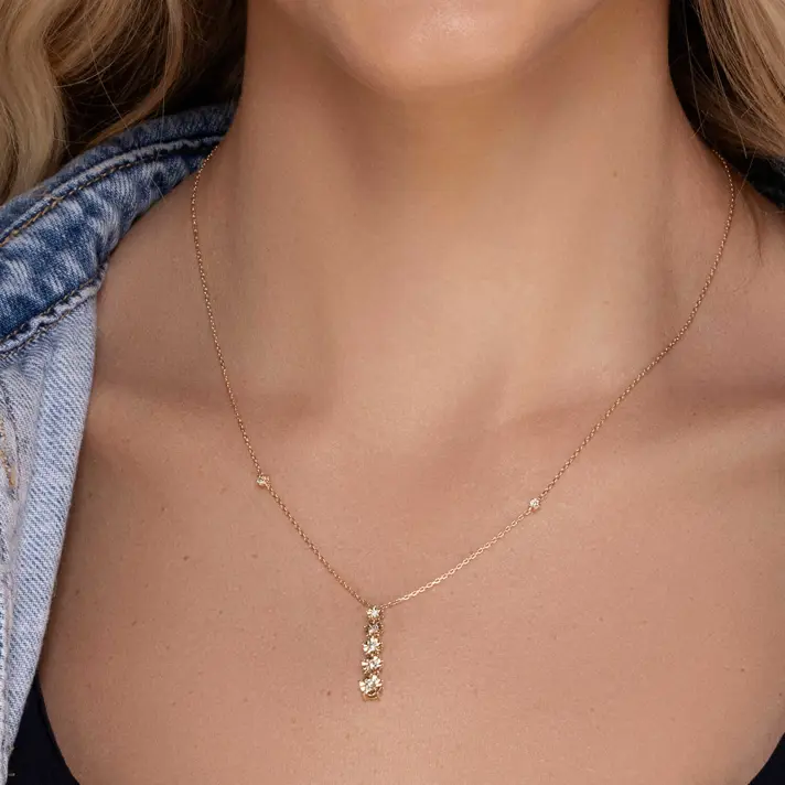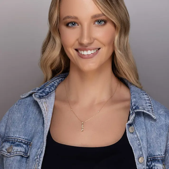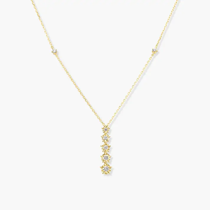 שרשרת זהב 14K ובמרכזה תליון המוכב מ 5 יהלומים התלויים אחד מעל השני וסביבם טבעת זהב בעיבוד לייזר מנצנץ. בשרשרת עצמה משובצים עוד 2 יהלומים ובסה"כ משובצים בשרשרת 7 יהלומים במשקל של כרבע קראט. אורך השרשרת 43 ס"מ, אורך התליון 2.7 ס"מ.