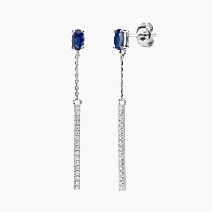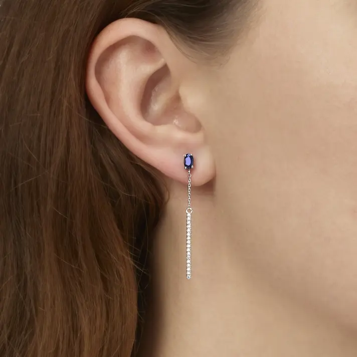 עגילי זהב לבן 14K משובצים אבני ספיר צמודות לאוזן אליהם מחוברת שרשרת ובסופה מבנה זהב משובץ 34 יהלומים טבעיים ונוצצים. אורך העגילים 3.9 ס"מ.